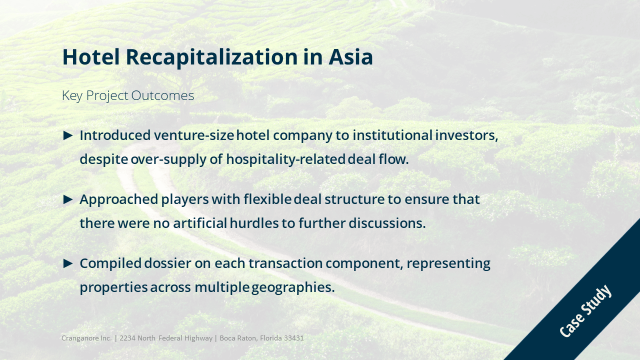 Project Design. We relied on our heritage in investment strategy to develop and distribute proprietary analysis on selected macro-themes, such as China’s dominance of the international travel market. Once we identified investor interest within our network, we complemented those reports with professionally-developed deal material, featuring portfolio properties in Mongolia and Indochina, among other Asian locations.