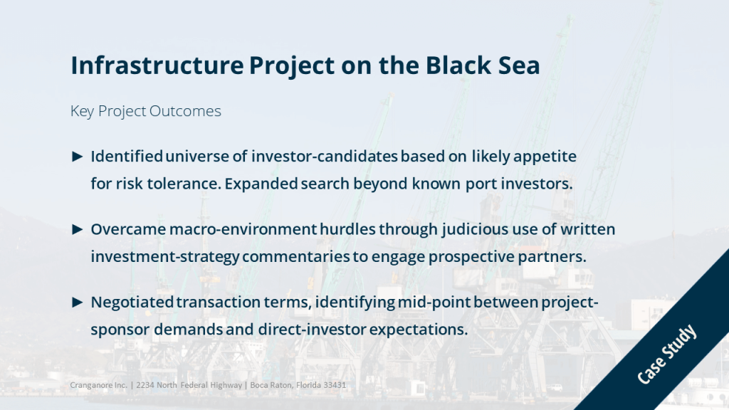 We worked with an investor group in Eastern Europe to find a development partner for their deep-water port project. The prospects for success were seemingly dim. In 2009—when we began the project—the world was deep in recession, the market for infrastructure projects was all but frozen, and most investors were not interested in assuming direct portfolio risk. Global operators in the highly cyclical port business were relying on a few profitable facilities to subsidize the rest of their holdings.
