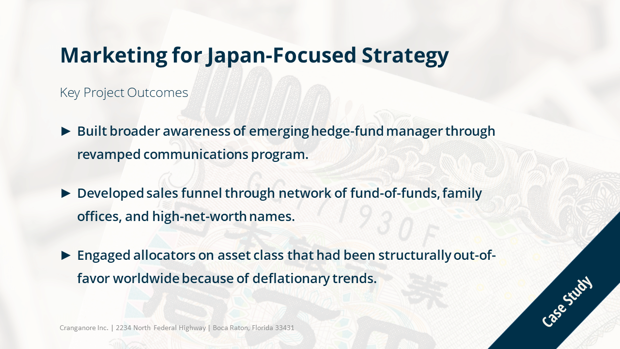 Follow-Through. The result was more effective awareness-building with investor-prospects and greater relationship impact with investor-clients. Prior to rolling-out our work, fund leadership—as an emerging hedge-fund manager—was frustrated by the challenges of targeting size-appropriate capital sources. We delivered a heightened impression of professionalism to support more aggressive asset-capture activity, while maneuvering through a faltering environment for Japan-focused advisors. ■