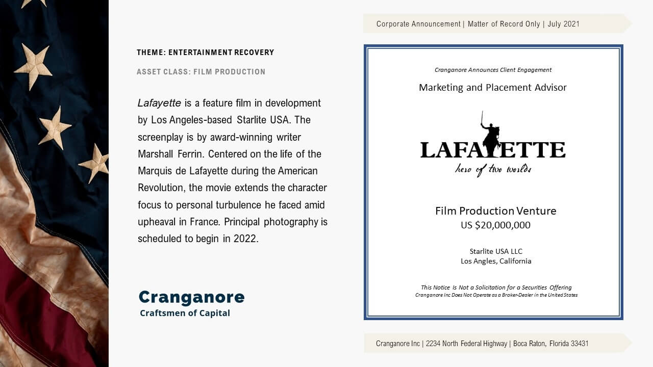 Our relationship with Los Angeles-based Starlite USA is centered on identifying global sources of capital for feature movie production. While film finance is traditionally a high-risk proposition, we focus on projects that have proven pedigree in screenwriting, acting, and directing to mitigate commercial concerns. Importantly, Our work in Hollywood is aligned with a resurgence of entertainment activity. New-found programming requirements of the major streaming companies is bolstering production demand to unprecedented levels. During the pandemic, the movie industry came to a near-complete standstill, with limited activity focused narrowly on post-production needs.
